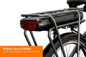 Door de 518Wh batterij heeft deze fiets, afhankelijk van het gebruik, een actieradius van tussen de 60 en 100 kilometer. Je kan de auto veel zo vaker laten staan! De ondersteuning is eenvoudig in te stellen door gebruik te maken van de moderne digitale display.