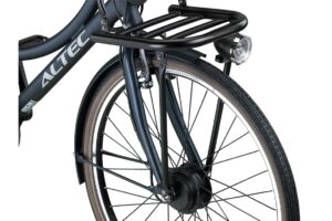 Altec Kratos E-bike Dames 53cm 518Wh N3 – Is zowel een comfortabele als praktische fiets! Dit is te danken aan de combinatie van elektrische trap ondersteuning, versnellingen en de handige voordrager. Ook zonder dat de ondersteuning aanstaat rijdt u lekker door de 3 Shimano Versnellingen. Zo neemt u gemakkelijk extra bagage mee onderweg. Het frame bestaat uit aluminium en is dus goed bestand tegen roest door regen of andere nattigheid. Een elektrische fiets moet natuurlijk over goede remmen beschikken. De Altec Kratos heeft op het achterwiel een betrouwbare Shimano Rollerbrake en op het voorwiel een V-brake. De zichtbaarheid van u en de fiets worden in het donker gegarandeerd door de LED verlichting die op batterij werkt. De fiets onbeheerd achterlaten is geen enkel probleem door het Axa Solid Plus slot.