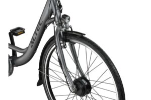 Altec Sapphire E-Bike Dames 53cm Dim Grey 518Wh N7– Is een betaalbare e-bike met genoeg specificaties voor een aangename rit! Het frame is zeer stevig en bestaat volledig uit staal. Dit zorgt er wel voor dat het gewicht van de fiets, samen met de accu en voorwielmotor, aan de hoge kant is. Let hierop wanneer u de fiets op wilt tillen. Door de 7 Shimano Nexus versnellingen is het ook zonder elektrische trapondersteuning lekker rijden. Door de hogere snelheid van een e-bike zijn goede remmen extra belangrijk. U kunt dan ook gebruik maken van de betrouwbare V-brake handremmen. De stuurpen is verstelbaar zodat u altijd een fijne rijhouding aan kan nemen. Door het Axa Solid Plus slot met het ART keurmerk, is de Altec Sapphire te verzekeren tegen diefstal. Wel zo fijn bij een duurdere aankoop! In het donker zorgt de LED verlichting er voor dat u goed zichtbaar en dus veilig onderweg bent.