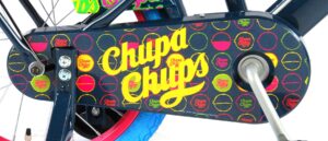 Chupa Chups Oma 16 inch kinderfiets. Volare heeft een fleurige nieuwe lijn Oma-fietsen ontworpen in de stijl van Chupa Chups. De fiets heeft een sterk zwart frame en is met felle kleuren prachtig versiert. De kettingkast is, ter bescherming van de kleine vingertjes, gesloten. Om snel te kunnen leren fietsen heeft de fiets afneembare zijwielen. Voor iedereen die zijn spulletjes graag mee wil nemen op de fiets, heeft de fiets zowel een achter- als voordrager. Verder heeft de fiets een handrem en een fietsbel.