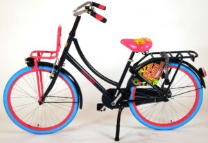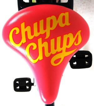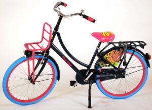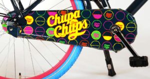 Chupa Chups Oma 24 inch kinderfiets. Volare heeft een fleurige nieuwe lijn Oma-fietsen ontworpen in de stijl van Chupa Chups. De fiets heeft een sterk zwart frame en is met felle kleuren prachtig versiert. De kettingkast is, ter bescherming van de kleine vingertjes, gesloten. De fiets is voorzien van een standaard. Voor iedereen die zijn spulletjes graag mee wil nemen op de fiets, heeft de fiets zowel een achter- als voordrager. Verder heeft de fiets een handrem en een fietsbel.