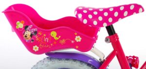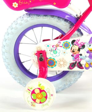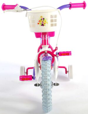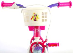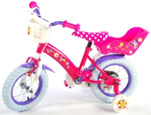 Disney Minnie Bow-Tique kinderfiets 12 inch. De Disney Minnie Mouse Bow-Tique meisjesfiets is onder alle meisjes uiterst gewild. Wij hebben een prachtige Minnie Bow-Tique fiets ontworpen in de prachtige kleurstelling roze. De fiets heeft een poppenzitje achter en een kunststof mandje voor, zodat ieder meisje haar spulletjes mee kan nemen maar haar handjes veilig aan het stuur kan houden. Verder heeft de fiets ter bescherming van de kleine vingertjes een gesloten kettingkast. Ook is de fiets voorzien van een handrem en een terugtraprem en frisse witte bandjes met metalen velgen. Om snel te kunnen leren fietsen heeft de fiets twee afneembare zijwielen. Welk meisje wil deze fiets nu niet? Official Licensed Disney Product.