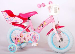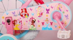Disney Princess 12 inch meisjesfiets. Ieder meisje heeft wel eens een van de films van Walt Disney gezien waarin knappe prinsessen zoals Belle, Doornroosje of Assepoester de show stelen. Bijna alle meisjes dromen ervan om later, als zij groot zijn, een échte prinses te zijn. Voor iedere jonge prinses in spé heeft Volare een prachtige 12 inch meisjesfiets ontworpen! De fiets is compleet met de mooie poppenzit en het handige fietsmandje, zodat de kleine prinses haar spulletjes overal mee naar toe kan nemen. Verder is deze fiets voorzien van een gesloten kettingkast, ter bescherming van de kleine vingertjes, kunststof spatborden en afneembare zijwieltjes om snel te kunnen leren fietsen. Om vaart te kunnen minderen heeft de fiets twee handremmen (GEEN TERUGTRAPREM) Op deze fiets wil ieder meisje wel naar school of naar haar vriendinnetjes fietsen! Disney Official Licensed Product.