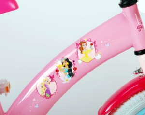Disney Princess 16 inch meisjesfiets. Ieder meisje heeft de Walt Disney films met prachtige prinsessen in de hoofdrol wel eens gezien. Alle meisjes willen dan ook een echt prinses zijn, dit gaat zeker lukken op deze mooie Disney Princess fiets. De fiets heeft een terugtraprem en voorrem, een veilige dichte kettingkast, stevige afneembare zijwielen en een sprookjesachtig design. Ook heeft de fiets een poppenzitje en een kunststof mandje, zodat alle jonge prinsessen in spé hun spulletjes mee kunnen nemen op avontuur. Top kwaliteit voor een lage prijs! Dit is een Official Disney Licensed Product