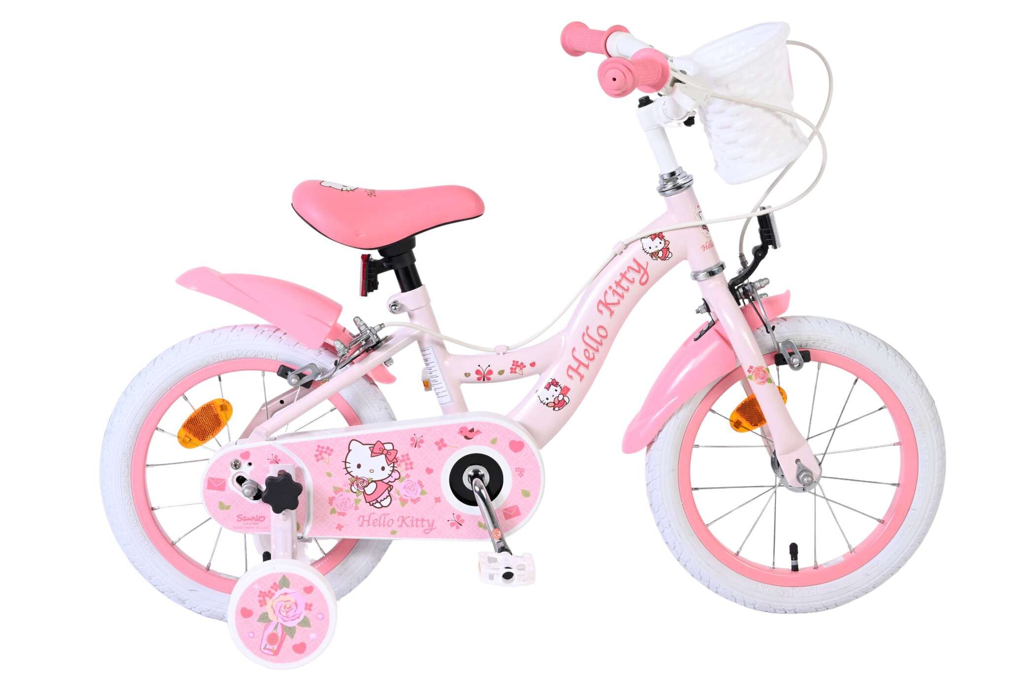 Met de Volare Hello Kitty 14 inch kinderfiets in lichtroze wordt leren fietsen een feestje. Deze vrolijke fiets is ontworpen om jonge fietsers een veilige en comfortabele start te geven, met een stabiele en kindvriendelijke opbouw.