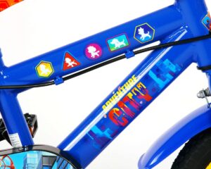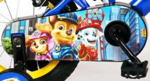 Paw Patrol 12 inch. Paw Patrol is een populaire televiesieserie voor de jonge jongens. Deze fiets met toffe stickers en een blauw frame is helemaal in de stijl van de televisieserie. Verder heeft de fiets spatborden, een volledig gesloten kettingkast ter bescherming van de kleine vingertjes en een in hoogte verstelbaar stuur. Om vaart te kunnen minderen heeft de fiets twee handremmen (GEEN TERUGTRAPREM) en met de bidon achterop heeft uw kind altijd iets te drinken bij zich. De 12 inch Paw Patrol Kinderfiets is voorzien van afneembare zijwielen en is geschikt voor kinderen tussen de 3 en 4 jaar met kledingmaat 92-104. Deze sportieve fiets is daarom een ideale fiets om op te leren fietsen. Vroemmm, daar ga je!