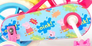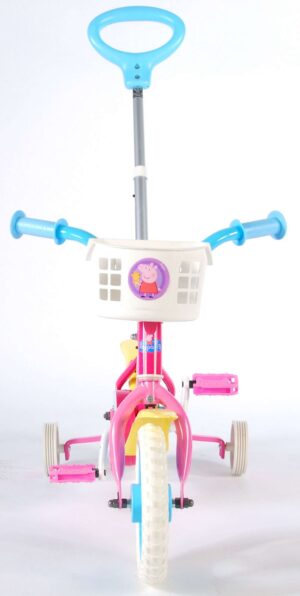 Peppa Pig meisjesfiets 10 inch. Peppa Pig is als tv serie uiterst populair onder alle meisjes in geheel europa. Volare heeft een hele mooie Peppa Pig meisjesfiets-lijn gemaakt. In prachtige kleurstelling zacht roze met een plastic fietsmandje. Sterk staal frame met kunststof velgen en frisse witte bandjes. Dichte kettingkast met prachtig vrolijk Peppa Pig design. De fiets heeft een duwstang waarmee u uw kindje gemakkelijk kunt begleiden. Om snel te kunnen leren fietsen heeft de fiets afneembare zijwieltjes. De fiets heeft een doortrap systeem. Dit is een speciale veiligheid-functie. Let op: geen handrem of terugtraprem! Welk meisje wil deze fiets nu niet? Official Licensed Product