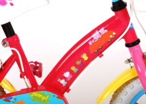 Peppa Pig kinderfiets 12 inch. Peppa Pig is als tvserie-figuur uiterst populair onder alle meisjes in heel Europa. Volare heeft een hele mooie Peppa Pig meisjesfiets-lijn gemaakt. In prachtige kleurstelling roze met blauw. De fiets heeft een poppenzitje achter en een fietsmandje voor, zodat ieder meisje haar handjes aan het stuur kan houden tijdens haar avontuur. Ook heeft de fiets twee handremmen (GEEN TERUGTRAPREM). Sterk staal frame met metalen velgen en frisse witte bandjes. De gesloten kettingkast heeft een prachtig en vrolijk Peppa Pig design. Welk meisje wil deze fiets nu niet? Official Licensed Product