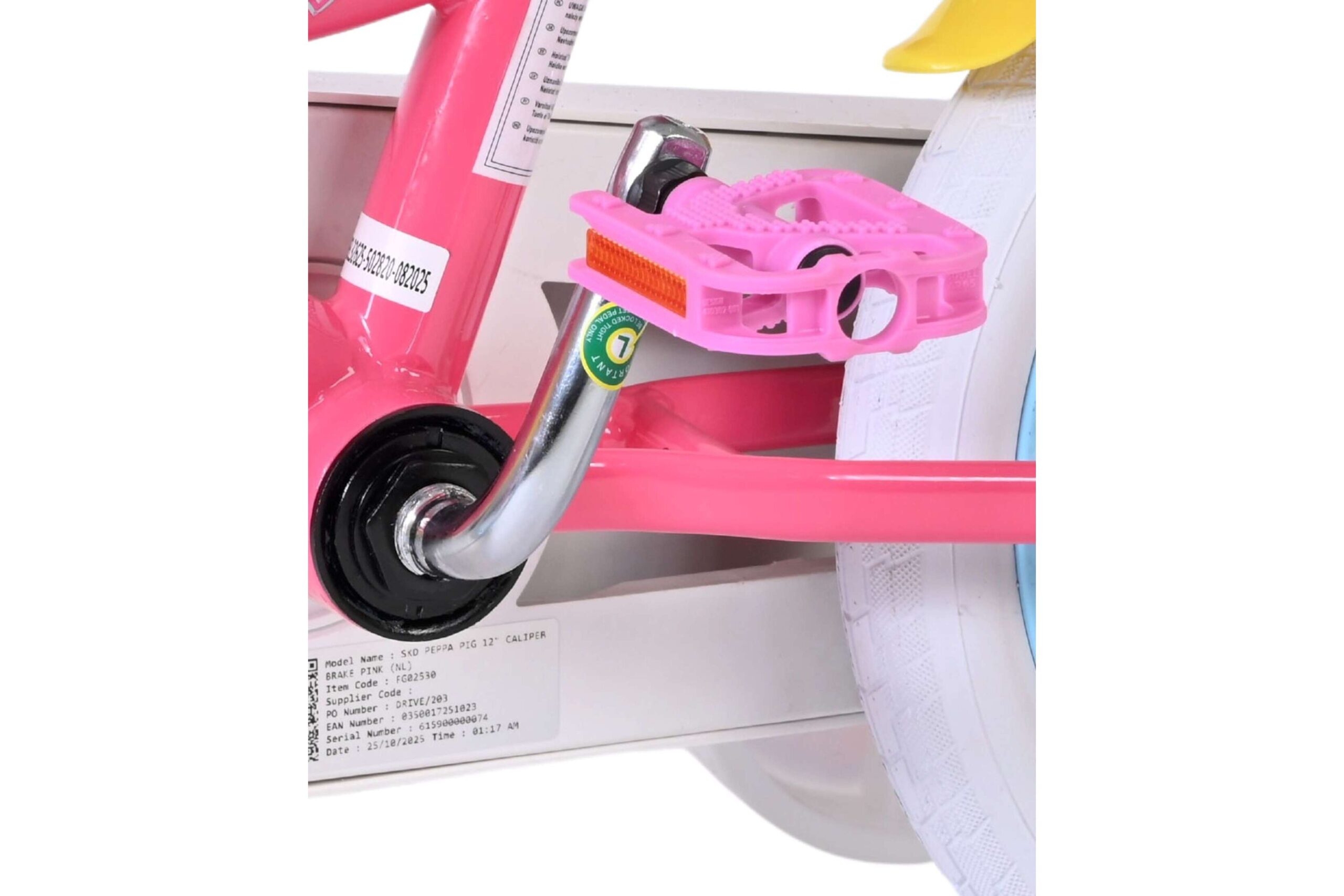 De Volare Peppa Pig 12 inch kinderfiets is perfect voor kleine Peppa-fans die graag op avontuur gaan! Deze vrolijke fiets is uitgevoerd in zachte Peppa Pig-kleuren en heeft een leuk mandje aan het stuur, ideaal om een favoriete knuffel of speelgoed mee te nemen tijdens elke rit.