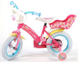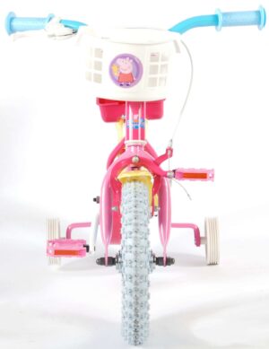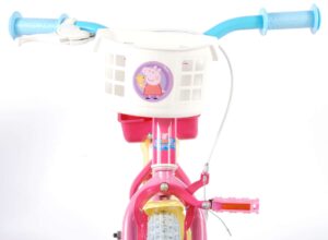 Peppa Pig kinderfiets 12 inch. Peppa Pig is als tv serie uiterst populair onder alle meisjes in geheel Europa. Volare heeft een hele mooie Peppa Pig meisjesfiets-lijn gemaakt. In prachtige kleurstelling roze met blauw. De fiets heeft een poppenzitje achter en een fietsmandje voor, zodat ieder meisje haar handjes aan het stuur kan houden tijdens haar avontuur. Ook heeft de fiets zowel een hand- als terugtraprem. Sterk staal frame met metalen velgen en frisse witte bandjes. De gesloten kettingkast heeft een prachtig en vrolijk Peppa Pig design. Welk meisje wil deze fiets nu niet? Official Licensed Product