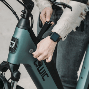 Het frame heeft een comfortabele Lage instap. Je plaatst en verwijdert eenvoudig de akku dankzij het draaglusje.