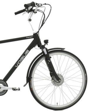 - De Vogue Premium Male is een 7 versnellingen stijlvolle e-bike voor mannen met een hoge instap, en zeer geschikt voor lange afstanden. Deze e-bike wordt vooral gebruikt voor woon-werkverkeer en levert de hoogste prestaties onder alle omstandigheden. De verende voorvork en zadelpen zorgen ervoor dat je comfortabel rijdt over elk type weg. De voorwielmotor is effectief, is geruisloos en is onderhoudsvriendelijk. Daarnaast beschikken al onze voorwielmotor e-bikes voor uw veiligheid over een remlicht. De sensor zorgt voor de juiste afstemming tussen de motor en je rotatie, waardoor je eenvoudig de gewenste snelheid behaalt. Zowel de achter- als voorrem is de uitvoerig geteste Shimano Rollerbrake. Met een maximale snelheid van 25 km/h kom je veilig en snel op je eindbestemming.