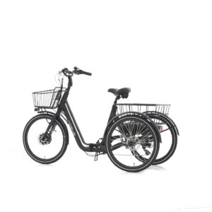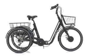 De Vogue Tri-Velo is een sportieve e-bakfiets voor de doelgroep ouderen of mindervaliden. Deze bakfiets beschikt over een stabiele wegligging met twee wielen achter, en één voor. De Shimano derailleurversnelling met 7 versnellingen geeft je genoeg mogelijkheden in combinatie met 3 digitale ondersteuningen vanuit de motor. Het framemateriaal is aluminium en de kleur is matzwart. Zowel voor als achter is opbergruimte in de vorm van een mand. De maximale snelheid is 25 kilometer per uur, zeer geschikt voor de stedelijke én rurale omgeving.