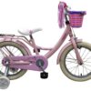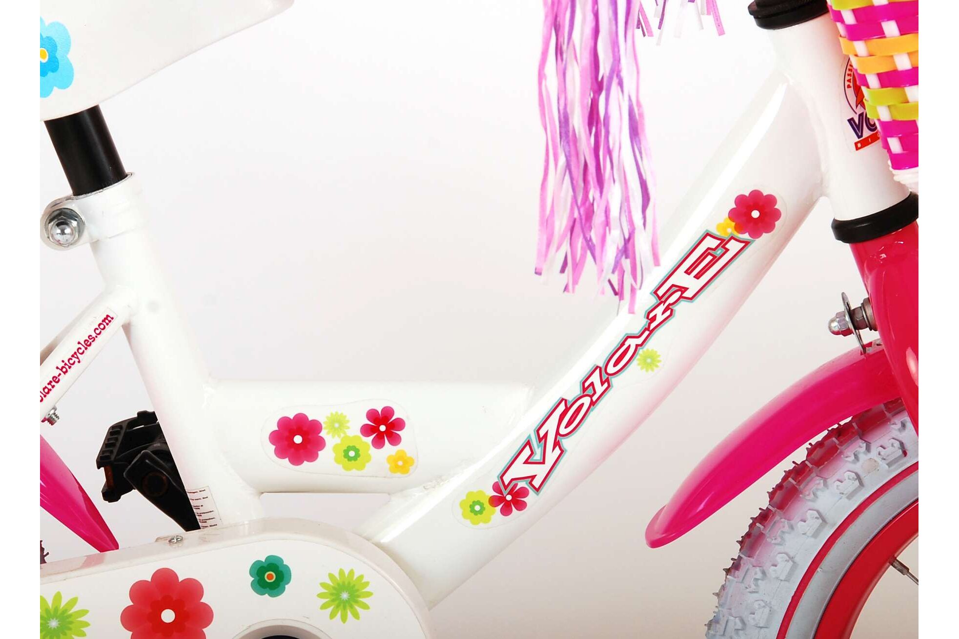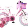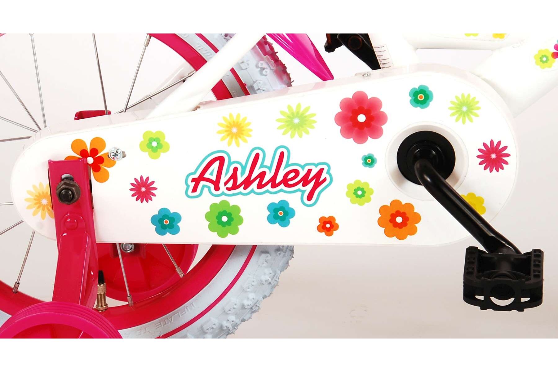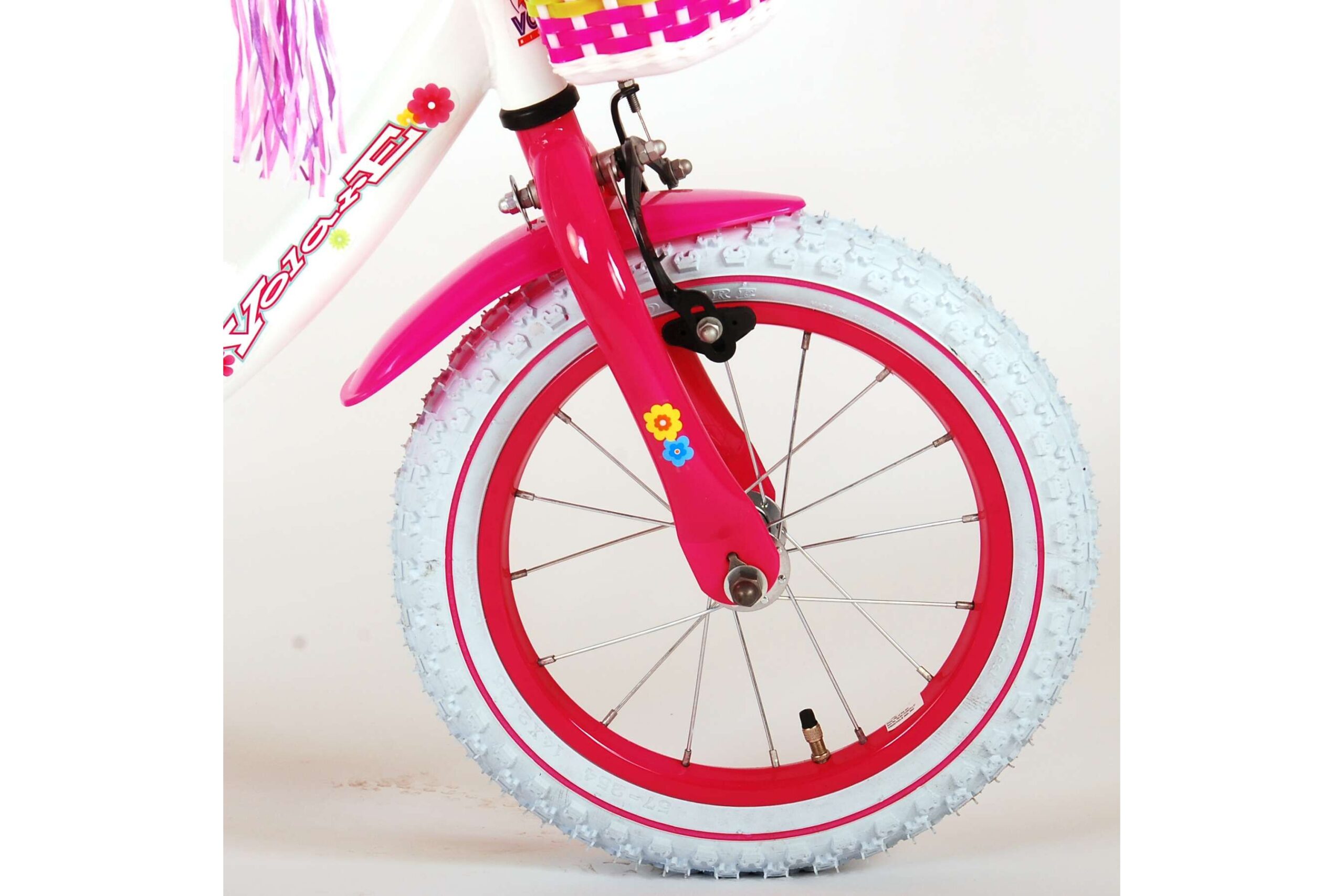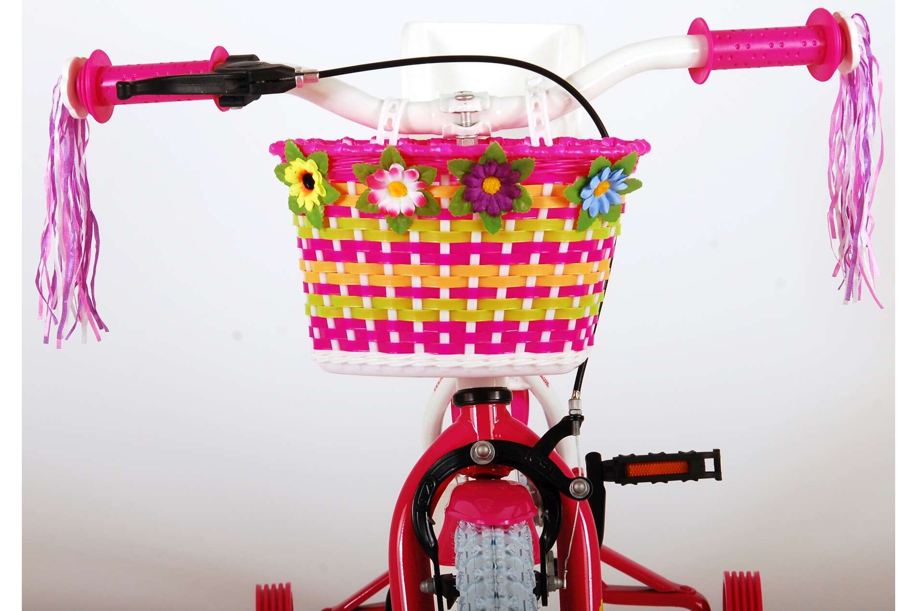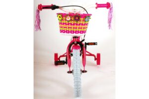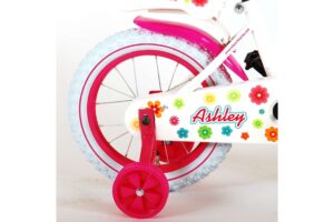 Volare Ashley meisjesfiets 14 inch. De Volare Ashley fietsen zijn geschikt voor alle fleurige dametjes. Zowel het frame van de fiets als het praktische kunststofmandje zijn voorzien van een prachtig bloemetjesdesign. De fiets beschikt over makkelijk afneembare zijwieltjes om snel te kunnen leren fietsen, een stevige handrem en een achteruittraprem. Bovendien heeft de fiets een poppenzitje, zodat ieder dametje haar pop veilig kan vervoeren en zelf haar handjes aan het stuur kan houden. Een top fiets voor een lage prijs!