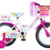 Volare Ashley 16 inch meisjesfiets. Deze beeldige Volare Ashley fiets is dé fiets die ieder meisje wil hebben. De achterdrager is geïntegreerd in het frame, waardoor de fiets een strak en modern uiterlijk heeft. Op deze achterdrager en in het fietsmandje kunnen alle belangrijke spulletjes mee worden genomen, waardoor uw kindje veilig de handjes aan het stuur kunnen houden. Met de handrem en terugtraprem kan de vaart worden verminderd. Het zachte zadel en de handvaten zorgen voor extra comfort en ter bescherming van de kleine vingertjes is de kettingkast gesloten. Met de fietsbel kun je iedereen laten weten dat je de hoek om komt. De afneembare zijwieltjes zorgen ervoor dat deze fiets een ideale fiets is om snel en goed te kunnen leren fietsen. De 16 inch luchtbanden van deze Volare Ashley fiets zorgen ervoor dat de fiets geschikt is voor meisjes tussen de 4 en 6 jaar oud met kledingmaat 104-110.