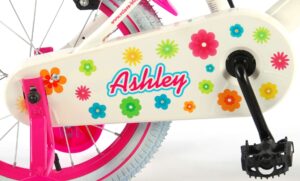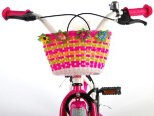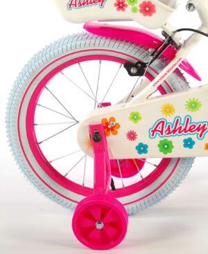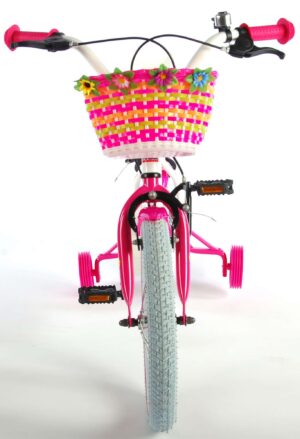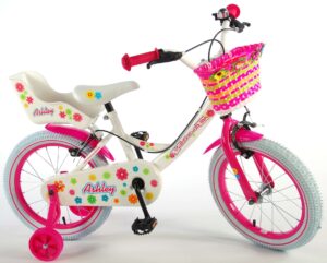 Volare Ashley meisjesfiets 16 inch. De Volare Ashley fietsen zijn geschikt voor alle fleurige dametjes. Zowel het frame van de fiets als het praktische kunststofmandje zijn voorzien van een prachtig bloemetjesdesign en een fietsbel. De fiets beschikt over makkelijk afneembare zijwieltjes om snel te kunnen leren fietsen, twee stevige handremmen (ZONDER TERUGTRAPREM). Bovendien heeft de fiets een poppenzitje, zodat ieder dametje haar pop veilig kan vervoeren en zelf haar handjes aan het stuur kan houden. Een top fiets voor een lage prijs!