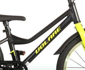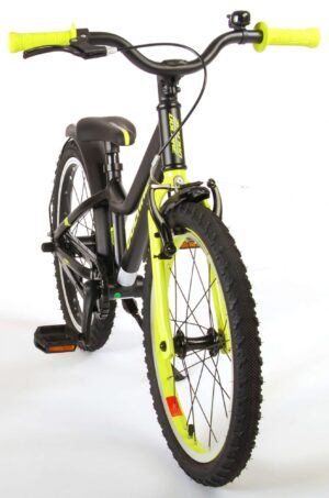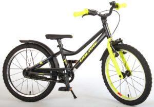 Volare Blaster 18 inch kinderfiets. De stoere Volare Blaster kinderfietsenreeks is van superieure kwaliteit. Het frame van deze fiets is gemaakt van ultra licht aluminium, slechts 6.5 kilo! Ook onderdelen zoals het stuur en het fietsstandaard zijn uit aluminium vervaardigd. Om vaart te kunnen minderen heeft de fiets een veilig Aluminium V-brake systeem met zowel een handrem als terugtraprem. De fiets heeft geen zijwielen, maar een praktisch en sterk aluminium standaard. De handvaten zijn van Kraton, een heerlijk zacht rubber, waardoor deze lekkerder in de hand liggen en extra comfort bieden. De zadelbuis is extra laag met een extra lange zadelpen, waardoor de fiets met uw kind mee kan groeien. De spatborden zijn mooi gevormd en iets langer dan normaal, waardoor zij al het opspattende vuil tijdens het crossen tegenhouden. Daarnaast heeft de fiets een aluminium smart control systeem, dat ervoor zorgt dat het stuur begrensd is (niet in hoogte verstelbaar). De stoere kettingkast is een grote toevoeging voor het krachtige en superstoere design van deze fiets met zijn strakke aluminium frame en groene details. De fiets is voor 85% afgemonteerd. De 18 inch luchtbanden maken dat deze fiets geschikt is voor jongens tussen de 4 en 7 jaar oud met kledingmaat 104-116. Deze Volare Blaster kinderfiets inspireert iedere jongen om zijn wereld te ontdekken!