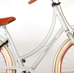 Volare Classic Oma damesfiets 28 inch 45 centimeter. Deze mat zilveren Classic Oma fiets is de moderne uitvoering van deze ultieme klassieker! Het sterke Aluminium frame heeft een hippe uitstraling door zijn mat zilveren kleur. Op de achterdrager met snelbinders kunnen alle spullen mee worden genomen. De handvaten zijn voor extra comfort gemaakt van Kraton, een heerlijk zacht rubber. De fiets is voorzien van zowel een handrem als een terugtraprem. Voor de veiligheid heeft de fiets een deels omsloten kettingkast en voor- en achterverlichting. Verder heeft de fiets een fietsbel, een fietsslot met fietssleutel, een stevig standaard en spatborden. De 28 inch banden en het frame van 45 centimeter hoog maken de fiets geschikt voor dames vanaf 11 jaar oud met een binnenbeenlengte tussen de 80 en 97 centimeter.