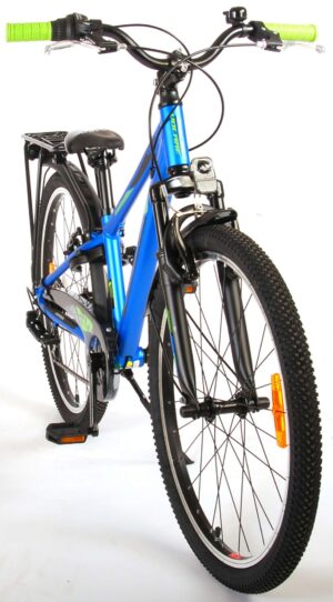 Volare Cross 24 inch kinderfiets. De Volare Cross kinderfietsrange is van superieure kwaliteit. Het aluminium geometrische frame in de stoere kleurstelling licht blauw met groene accenten maakt van deze fiets een echte eyecatcher. De zadelbuis is extra laag met een extra lange zadelpen, waardoor de fiets met uw kind mee kan groeien.Met de 6 versnellingen kan gemakkelijk extra vaart worden gemaakt. Om snelheid te verminderen heeft de fiets een veilig aluminium V-remsysteem met twee handremmen (geen terugtraprem!). De handvaten zijn van Kraton, een heerlijk zacht rubber, waardoor deze lekkerder in de hand liggen en extra comfort bieden. Op de achterdrager kunnen alle belangrijke spulletjes mee worden genomen. Voor de veiligheid heeft de fiets verlichting aan de voorkant en achterkant en bovendien beschikt de fiets over een fietsslot. Verder heeft de fiets aluminium velgen met stalen spaken en een sterk standaard en een fietsbel. De fiets is voor 85% afgemonteerd. De 24 inch luchtbanden maken deze fiets geschikt voor jongens tussen de 8 en 10 jaar oud met kledingmaat 128-140. Iedere jongen wil op deze fiets naar school crossen! Vroemmm!