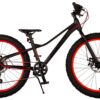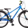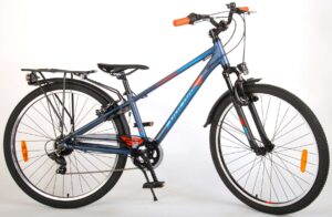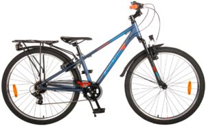 Volare Cross 26 inch kinderfiets. De Volare Cross kinderfietsrange is van superieure kwaliteit. Het aluminium geometrische frame in de stoere kleurstelling donker blauw maakt van deze fiets een echte eyecatcher. Met de 7 versnellingen kan gemakkelijk extra vaart worden gemaakt. Om snelheid te verminderen heeft de fiets een veilig aluminium V-remsysteem met twee handremmen (geen terugtraprem!). De handvaten zijn van Kraton, een heerlijk zacht rubber, waardoor deze lekkerder in de hand liggen en extra comfort bieden. Op de achterdrager kunnen alle belangrijke spulletjes mee worden genomen. Voor de veiligheid heeft de fiets verlichting aan de voorkant en achterkant en bovendien beschikt de fiets over een fietsslot. Verder heeft de fiets aluminium velgen met stalen spaken en een sterk standaard en een fietsbel. De fiets is voor 85% afgemonteerd. De 26 inch luchtbanden maken deze fiets geschikt voor jongens tussen de 9 en 12 jaar oud met kledingmaat 140-152. Iedere jongen wil op deze fiets naar school crossen! Vroemmm!
