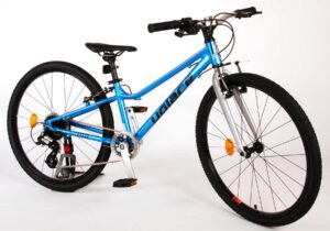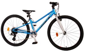De 24 inch Volare Dynamic is een stoere jongensfiets waar ieder kinderhart sneller van gaat kloppen. Om vaart te kunnen minderen heeft de fiets een veilig Aluminium V-brake systeem met twee handremmen (geen terugtraprem!). De handvaten zijn van Kraton, een heerlijk zacht rubber, waardoor deze lekkerder in de hand liggen en extra comfort bieden. Daarnaast is het frame van deze fiets gemaakt van ultra licht aluminium. De fiets is voor 85% afgemonteerd. De 24 inch luchtbanden maken dat deze fiets geschikt is voor jongens tussen de 8 en 10 jaar oud met kledingmaat 128-140. Op deze coole Volare Dynamic kinderfiets wil iedere jongen naar school fietsen! Vroemmmm…