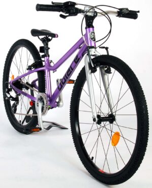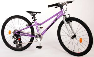 De 24 inch Volare Dynamic is een stoere meidenfiets waar ieder kinderhart sneller van gaat kloppen. Om vaart te kunnen minderen heeft de fiets een veilig Aluminium V-brake systeem met twee handremmen (geen terugtraprem!). De handvaten zijn van Kraton, een heerlijk zacht rubber, waardoor deze lekkerder in de hand liggen en extra comfort bieden. Daarnaast is het frame van deze fiets gemaakt van ultra licht aluminium. De fiets is voor 85% afgemonteerd. De 24 inch luchtbanden maken dat deze fiets geschikt is voor meiden tussen de 8 en 10 jaar oud met kledingmaat 128-140. Op deze coole Volare Dynamic kinderfiets wil iedere meid naar school fietsen! Vroemmmm…