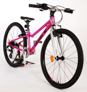 De 24 inch Volare Dynamic is een stoere meidenfiets waar ieder kinderhart sneller van gaat kloppen. Om vaart te kunnen minderen heeft de fiets een veilig Aluminium V-brake systeem met twee handremmen (geen terugtraprem!). De handvaten zijn van Kraton, een heerlijk zacht rubber, waardoor deze lekkerder in de hand liggen en extra comfort bieden. Daarnaast is het frame van deze fiets gemaakt van ultra licht aluminium. De fiets is voor 85% afgemonteerd. De 24 inch luchtbanden maken dat deze fiets geschikt is voor meiden tussen de 8 en 10 jaar oud met kledingmaat 128-140. Op deze coole Volare Dynamic kinderfiets wil iedere meid naar school fietsen! Vroemmmm…
