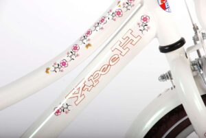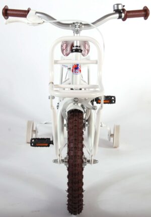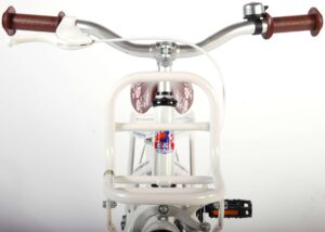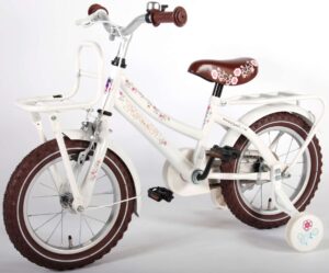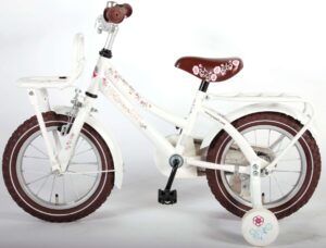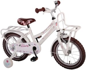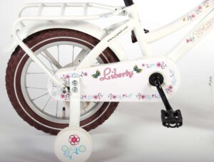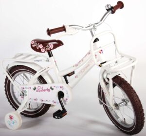 Volare Liberty Urban meisjesfiets 14 inch. De Liberty Urban fietsen zijn ultieme meisjesfietsen. Eerst waren de “grote” Liberty Urban fietsen in ons assortiment, maar door de grote vraag, hebben wij de frames ook maar voor de allerkleinste dametjes gemaakt. Deze witte kleur met bloemetjesdecor is toch helemaal fantastisch. Met voordragertje, net als Mama. Het stalen frame met drager voor en achter is van zeer hoge kwaliteit. Dichte kettingkast en afneembare stabiele zijwielen. Voorrem en terugtraprem.Top fiets! Deze fiets is voor 95% afgemonteerd, dus bijna fietsklaar. Wel zo gemakkelijk!