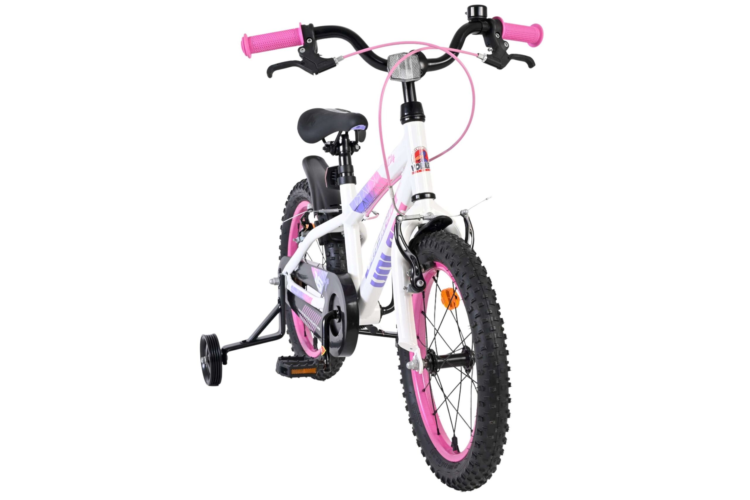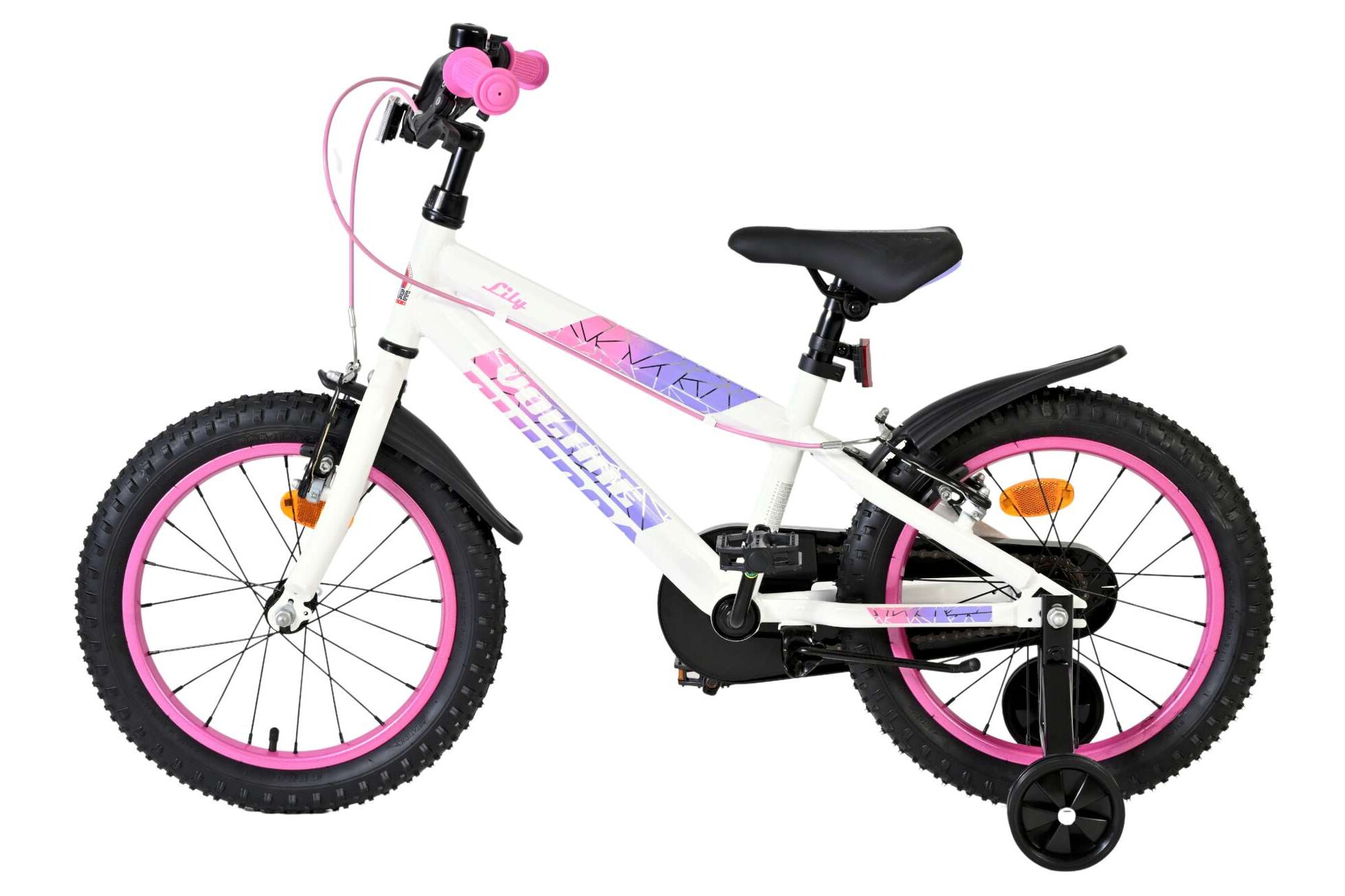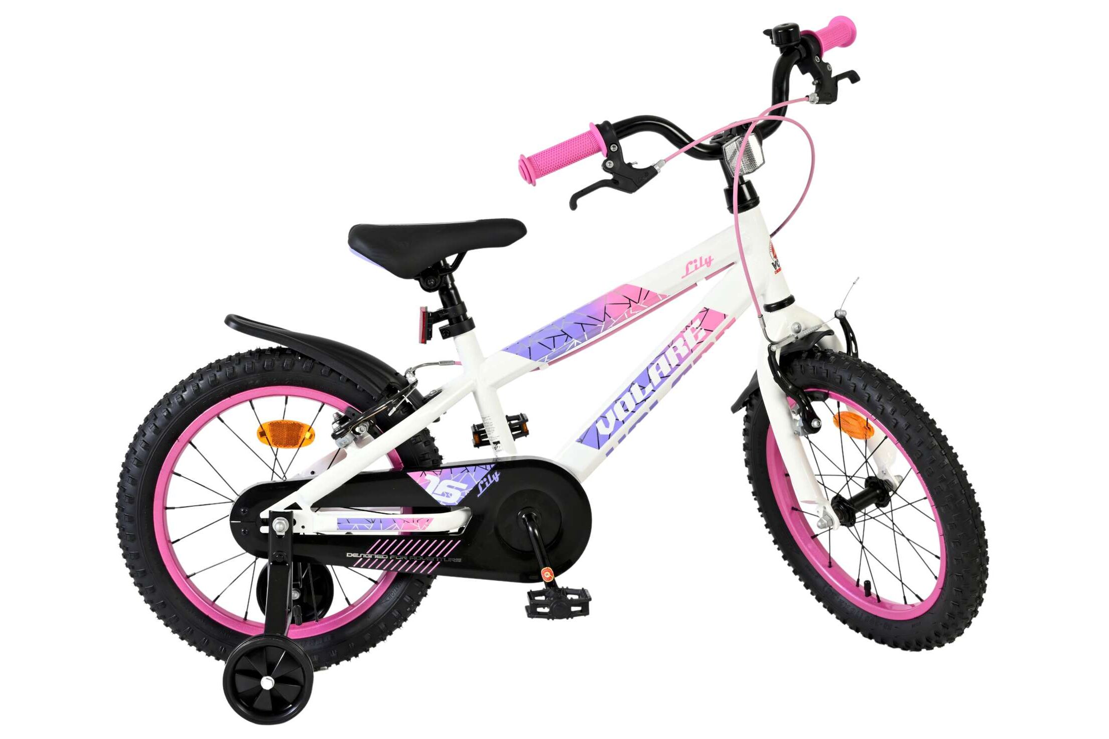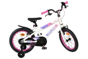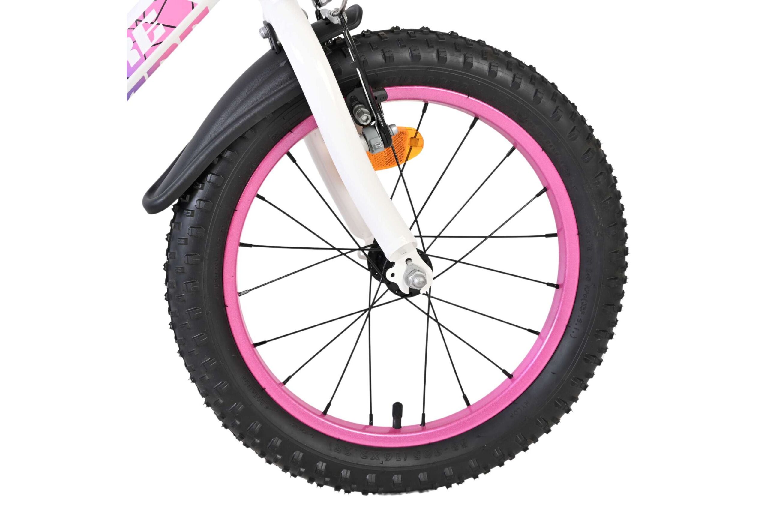 De Volare Lily 16 inch kinderfiets is een prachtige fiets voor jonge meiden die graag in stijl fietsen. Met haar frisse witte kleur, paarse en roze accenten en opvallende roze velgen en handvaten is deze fiets een echte eyecatcher.