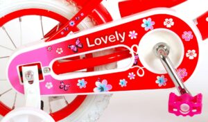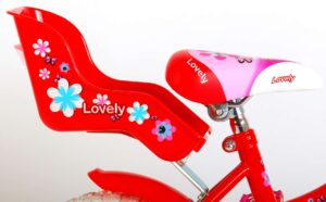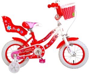 Volare Lovely 12 inch kinderfiets. De Volare Lovely 12 inch kinderfiets is dé fiets waar ieder meisje van droomt. De vlinders en bloemen op het frame, zadel en op de poppenzit maken het design van de rode fiets helemaal af. Om vaart te kunnen minderen heeft de fiets zowel een handrem als een terugtraprem. Ter bescherming van de kleine vingertjes heeft de fiets een gesloten kettingkast. Met de fietsbel kun je laten weten dat je de hoek om komt. Om spulletjes mee te kunnen nemen heeft de fiets een prachtig kunststof mandje en speciaal voor de poppen heeft de fiets een roze poppenzitje achter. Met de afneembare zijwieltjes kan ieder kind snel leren fietsen. De 12 inch luchtbanden maken de fiets geschikt voor kinderen tussen de 3 en 4,5 jaar oud met kledingmaat 92-104. Deze fiets is voor 95% afgemonteerd, dus bijna fietsklaar.