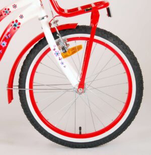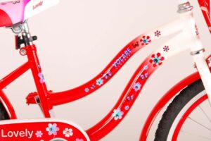 Volare Lovely 20 inch kinderfiets. De Volare Lovely 20 inch kinderfiets is dé fiets waar ieder meisje van droomt. De vlinders en bloemen op het frame en het zadel maken het design van de rode fiets helemaal af. Om vaart te kunnen minderen heeft de fiets zowel een handrem als een terugtraprem. De fiets heeft een wat stoerdere pistoltype kettingkast. Met de fietsbel kun je laten weten dat je de hoek om komt. Op de handige voordrager kunnen alle belangrijke spulletjes mee worden genomen. De 20 inch luchtbanden maken de fiets geschikt voor kinderen tussen de 6 en 8 jaar oud met kledingmaat 116-122.