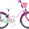 Volare Melody 20 inch kinderfiets. De prachtige Volare Melody fietsenreeks is van superieure kwaliteit. Het frame van deze fiets is gemaakt van ultra licht aluminium, slechts 12 kilo! Deze fiets met dit moderne frame, de stoere pistol type kettingkast en praktische voordrager is een must have voor iedere hippe meid. Om vaart te kunnen minderen heeft de fiets een veilig Aluminium V-brake systeem met en handrem en terugtraprem. Om de fiets makkelijk neer te kunnen zetten heef hij een sterk standaard. De handvaten zijn van Kraton, een heerlijk zacht rubber, waardoor deze lekkerder in de hand liggen en extra comfort bieden. De zadelbuis is extra laag met een extra lange zadelpen, waardoor de fiets met uw kind mee kan groeien. Daarnaast heeft de fiets een aluminium smart control systeem, dat ervoor zorgt dat het stuur begrensd is (niet in hoogte verstelbaar). Bovendien heeft de fiets voor- en achterverlichting. De fiets is voor 85% afgemonteerd. De 20 inch luchtbanden maken dat deze fiets geschikt is voor meiden tussen de 6 en 8 jaar oud met kledingmaat 116-122. Op deze hippe Volare Melody kinderfiets wil iedere meid naar school fietsen!