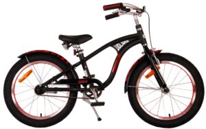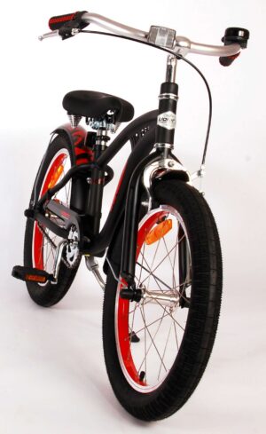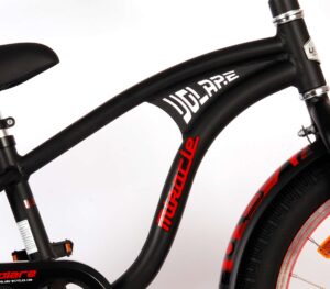 Volare Miracle Cruiser 18 inch kinderfiets. De prachtige Volare Miracle Cruiser fietsenreeks is van superieure kwaliteit. Het frame van deze fiets is gemaakt van aluminium, ultra licht dus! Deze fiets met dit moderne frame is een must have voor iedere stoere jongen. Om vaart te kunnen minderen heeft de fiets een handrem en terugtraprem. De handvaten van leer bieden extra comfort. Om de fiets makkelijk neer te kunnen zetten heeft hij een sterk standaard. De zadelbuis is extra laag met een extra lange zadelpen, waardoor de fiets met uw kind mee kan groeien. Het stuur is in hoogte verstelbaar. Op deze hippe Volare Miracle Cruiser kinderfiets wil iedere jongen naar school fietsen!