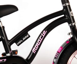 Volare Miracle Cruiser 14 inch kinderfiets. De prachtige Volare Miracle Cruiser fietsenreeks is van superieure kwaliteit. Het frame van deze fiets is gemaakt van aluminium, ultra licht dus! Deze fiets met dit moderne frame is een must have voor iedere stoere meid. Om vaart te kunnen minderen heeft de fiets een handrem en terugtraprem. De handvaten van leer bieden extra comfort. Om de fiets makkelijk neer te kunnen zetten heeft hij een sterke standaard. Montage zijwielen is bij dit model niet mogelijk. De zadelbuis is extra laag met een extra lange zadelpen, waardoor de fiets met uw kind mee kan groeien. Het stuur is in hoogte verstelbaar. De 14 inch luchtbanden maakt de Volare Miracle kinderfiets geschikt voor kinderen tussen de 3,5 en 5 jaar oud, met kledingmaat 98-110. Deze fiets is dé fiets om kinderen te inspireren om de wereld te gaan ontdekken!