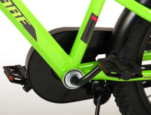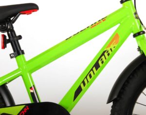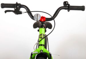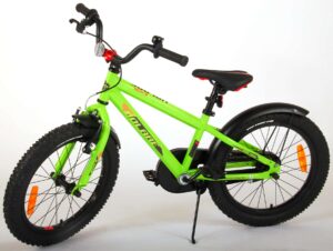Volare Rocky 18 inch kinderfiets 95% afgemonteerd. De Volare Rocky kinderfietsrange is van superieure kwaliteit. De Rocky fiets heeft aluminium velgen, een aluminium stuurpen, betere kwaliteit trappers, zwarte spaken en een luxe super zacht zadel met greep voor ouders. De 18 inch Rocky is een stoere jongensfiets met extra brede banden, waar ieder kinderhart sneller van gaat kloppen. Ook de spatborden zijn extra groot en mooi gevormd waardoor zij al het opspattende vuil tegenhouden. Om vaart te kunnen minderen heeft de fiets een veilig remsysteem met een stevige V-brake. De zadelbuis is extra laag met een extra lange zadelpen, waardoor de fiets met uw kindje mee kan groeien. Daarnaast heeft de fiets een aluminium smart conrtol systeem, dat ervoor zorgt dat het stuur begrensd is (niet in hoogte verstelbaar). De handvatten zijn gemaakt van Kraton, een zacht rubber, waardoor de handvatten heerlijk in de hand liggen. De fiets heeft een gesloten kettingkast, stevige standaard (geen zijwielen!!) en een fietsbel. Het geometrische frame in de felgroene kleur met watertransfer stickers maakt van deze fiets een echte eyecatcher. Deze fiets is dé fiets om kinderen te inspireren om de wereld te gaan ontdekken. Bovendien is de fiets voor 95% afgemonteerd, dus bijna fietsklaar. Wel zo gemakkelijk!