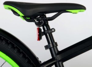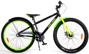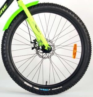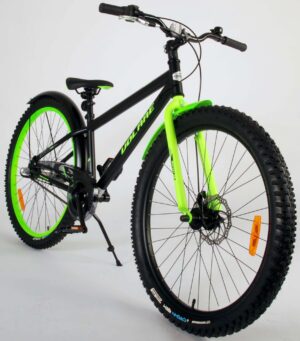 Volare Rocky 26 inch kinderfiets 95% afgemonteerd. De Volare Rocky kinderfietsrange is van superieure kwaliteit. De Rocky fiets heeft een Shimano Nexus 3 Speed versnelling inclusief terugtraprem, aluminium velgen, een aluminium stuurpen, betere kwaliteit trappers, zwarte spaken en een luxe super zacht zadel. De 26 inch Rocky is een stoere jongensfiets met extra brede “Fat” banden, waarbij de voorband dikker (2.60) is als de achterband (2.25), waar ieder kinderhart sneller van gaat kloppen. Ook de spatborden zijn extra groot en mooi gevormd waardoor zij al het opspattende vuil tegenhouden. Om vaart te kunnen minderen heeft de fiets een veilig voorremsysteem met een mechanische Disc Brake. De zadelbuis is extra laag met een extra lange zadelpen, waardoor de fiets met uw kind mee kan groeien. Daarnaast heeft de fiets een aluminium smart control systeem, dat ervoor zorgt dat het stuur begrensd is (niet in hoogte verstelbaar). De handvatten zijn gemaakt van Kraton, een zacht rubber, waardoor de handvatten heerlijk in de hand liggen. De fiets heeft een sportief pistoltype kettingkast, stevige aluminium standaard en een fietsbel. Het geometrische frame in sportieve stoere kleurstelling met watertransfer stickers maakt van deze fiets een echte eyecatcher. Deze fiets is dé fiets om kinderen te inspireren om de wereld te gaan ontdekken.