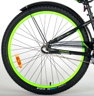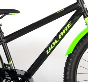 De Volare Rocky kinderfietsrange is van superieure kwaliteit. De Rocky fiets heeft een Shimano Nexus 3 Speed versnelling inclusief terugtraprem, aluminium velgen, een aluminium stuurpen, betere kwaliteit trappers, zwarte spaken en een luxe super zacht zadel. De 26 inch Rocky is een stoere jongensfiets met extra brede “Fat” banden, waarbij de voorband dikker (2.60) is als de achterband (2.25), waar ieder kinderhart sneller van gaat kloppen. Ook de spatborden zijn extra groot en mooi gevormd waardoor zij al het opspattende vuil tegenhouden. Om vaart te kunnen minderen heeft de fiets een veilig voorremsysteem met een mechanische Disc Brake. De zadelbuis is extra laag met een extra lange zadelpen, waardoor de fiets met uw kind mee kan groeien. Daarnaast heeft de fiets een aluminium smart control systeem, dat ervoor zorgt dat het stuur begrensd is (niet in hoogte verstelbaar). De handvatten zijn gemaakt van Kraton, een zacht rubber, waardoor de handvatten heerlijk in de hand liggen. De fiets heeft een sportief pistoltype kettingkast, stevige aluminium standaard en een fietsbel. Het geometrische frame in sportieve stoere kleurstelling met watertransfer stickers maakt van deze fiets een echte eyecatcher. Deze fiets is dé fiets om kinderen te inspireren om de wereld te gaan ontdekken.