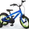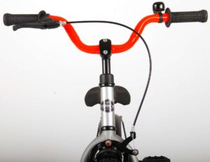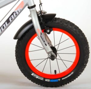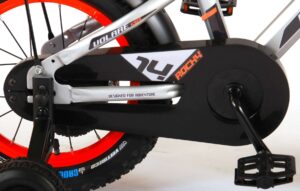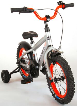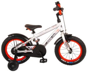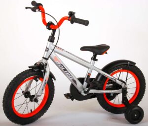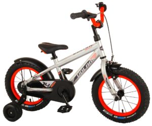 Volare Rocky 14 inch kinderfiets 95% afgemonteerd. De Volare Rocky kinderfietsrange is echt van superieure kwaliteit. De Rocky fiets heeft aluminium velgen, een aluminium stuurpen, betere kwaliteit trappers, zwarte spaken en een luxe super zacht zadel met greep voor ouders. De 14 inch Rocky is een stoere jongensfiets met extra brede banden, waar ieder kinderhart sneller van gaat kloppen. Ook de spatborden zijn extra groot en mooi gevormd waardoor zij al het opspattende vuil tegenhouden. Het stuur is in hoogte verstelbaar en de zadelbuis is extra laag met een extra lange zadelpen, waardoor de fiets met uw kindje mee kan groeien. De handvatten zijn gemaakt van Kraton, een zacht rubber, waardoor de handvatten heerlijk in de hand liggen. Het geometrische frame in de zilveren kleur met watertransfer stickers maakt van deze fiets een echte eyecatcher. De fiets heeft extra brede stoer uitziende zijwieltjes om snel te kunnen leren fietsen en een gesloten kettingkast om de kleine vingertjes te beschermen. Deze fiets is dé fiets om kinderen te inspireren om de wereld te gaan ontdekken. Bovendien is de fiets voor 95% afgemonteerd, dus bijna fietsklaar. Wel zo gemakkelijk!