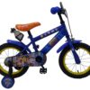 Volare Sportivo 14 inch kinderfiets. Het sterke stalen frame heeft met de stoere neon oranje met zwarte kleurstelling een zeer sportieve uitstraling. Met de bidon in de praktische bidonhouder heeft uw kind altijd iets te drinken bij zich. De spatborden houden al het opspattend vuil tegen. Om vaart te minderen heeft de fiets twee handremmen (GEEN TERUGTRAPREM). Ter bescherming van de kleine vingertjes is de kettingkast gesloten. Om snel te kunnen leren fietsen heeft de fiets afneembare zijwielen. De 14 inch luchtbanden maken de fiets geschikt voor stoere knullen tussen 3.5 en 5 jaar oud met kledingmaat 98-110.=