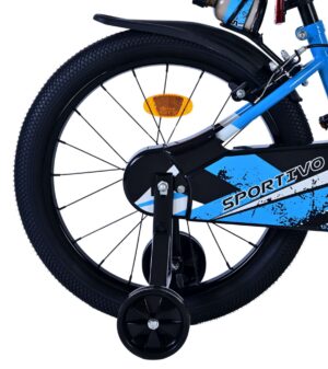Veiligheid staat voorop! Daarom heeft deze gave fiets twee handremmen en geen terugtraprem! Het sterke stalen frame heeft met de stoere blauw met zwarte kleurstelling een zeer sportieve uitstraling. Met de bidon in de praktische bidonhouder heeft uw kind altijd iets te drinken bij zich. De spatborden houden al het opspattend vuil tegen. Ter bescherming van de kleine vingertjes is de kettingkast gesloten. De fiets heeft zijwielen en een stevige standaard.