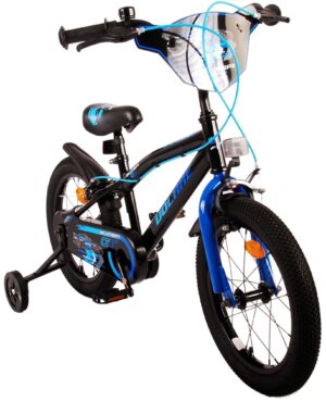 Veiligheid staat voorop! Daarom heeft deze gave fiets geen terugtraprem maar twee handremmen, een gesloten kettingkast en afneembare zijwieltjes. Daarnaast heeft de fiets reflectoren in de wielen, voor- en achterop de fiets en een leuke bel. Ook aan het comfort is gedacht. De mooie zwarte Volare fiets met blauwe accenten heeft een zacht zadel, een tijdloos design, en een uniek frame dat wel tegen een stootje kan. Om zo lang mogelijk van de fiets te kunnen genieten zijn het zadel en stuur in hoogte verstelbaar. Wordt geleverd inclusief al het montagemateriaal dat nodig is om de fiets in elkaar te zetten!