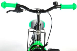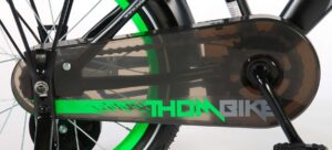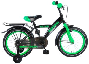 Volare Thombike 16 inch jongensfiets Satin Black Green. Speciaal voor alle jonge avonturiers heeft Volare een nieuwe Thombike collectie ontworpen. De fiets heeft een super stoer frame in een zwarte kleur met groene details en stevige banden om de hele stad mee door te kunnen crossen. Verder beschikt de fiets over een handrem en een terugtraprem, een fietsbel en een stevig standaard. Ook heeft de fiets een sterke achterdrager. Op deze coole fiets maakt iedere stoere bink de blits! Deze fiets is voor 95% afgemonteerd, dus bijna fietsklaar.