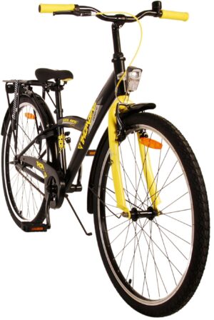 Veiligheid staat voorop! Daarom heeft deze gave fiets een handrem en terugtraprem en verlichting op batterij voor en achter. Daarnaast heeft de fiets een leuke bel en reflectoren in de wielen. Ook aan het comfort is gedacht. De mooie zwarte Volare fiets met gele accenten heeft een luxe zacht zadel en extra zachte handvaten, een handige achterdrager, en een stevig frame dat wel tegen een stootje kan. Verder heeft de fiets een standaard zodat hij netjes blijft staan en een sterk slot. Om zo lang mogelijk van de fiets te kunnen genieten heeft deze een extra lange zadelpen waardoor de fiets nóg langer met het kind meegroeit en ook het stuur is in hoogte verstelbaar.